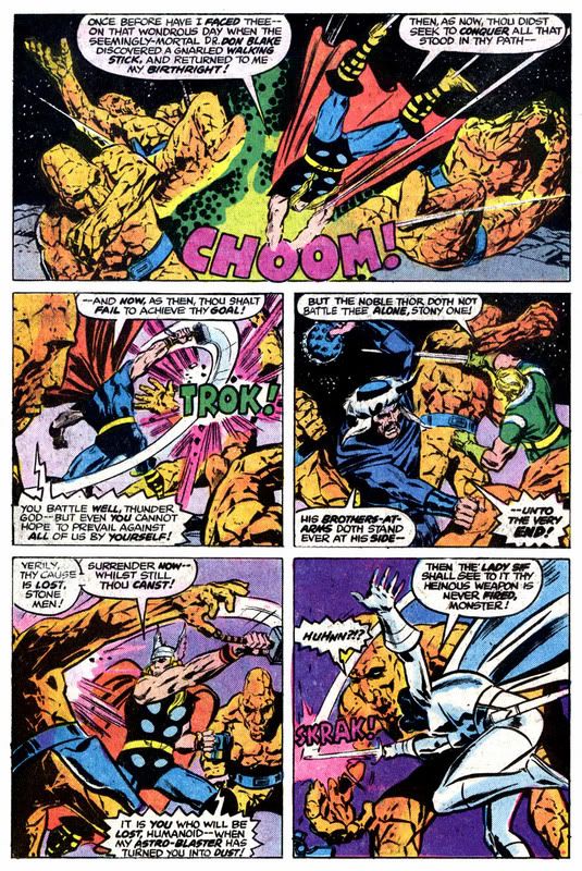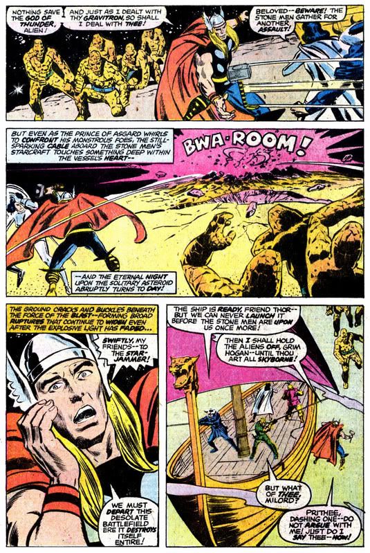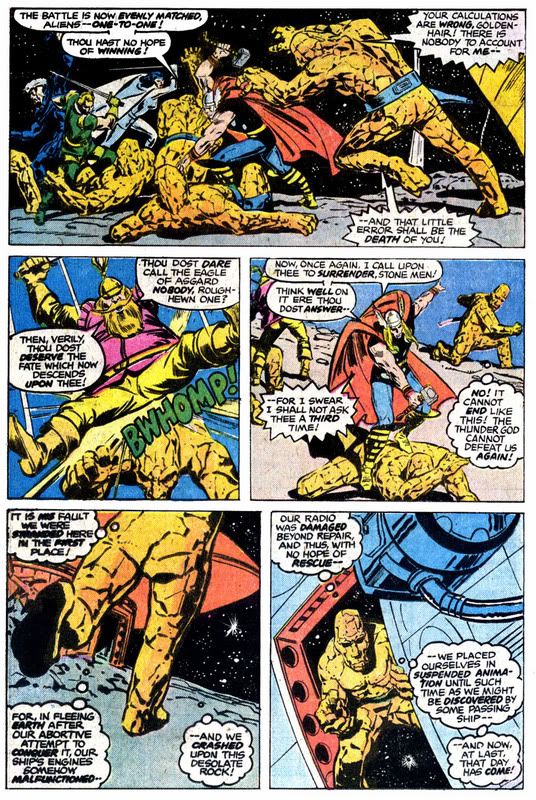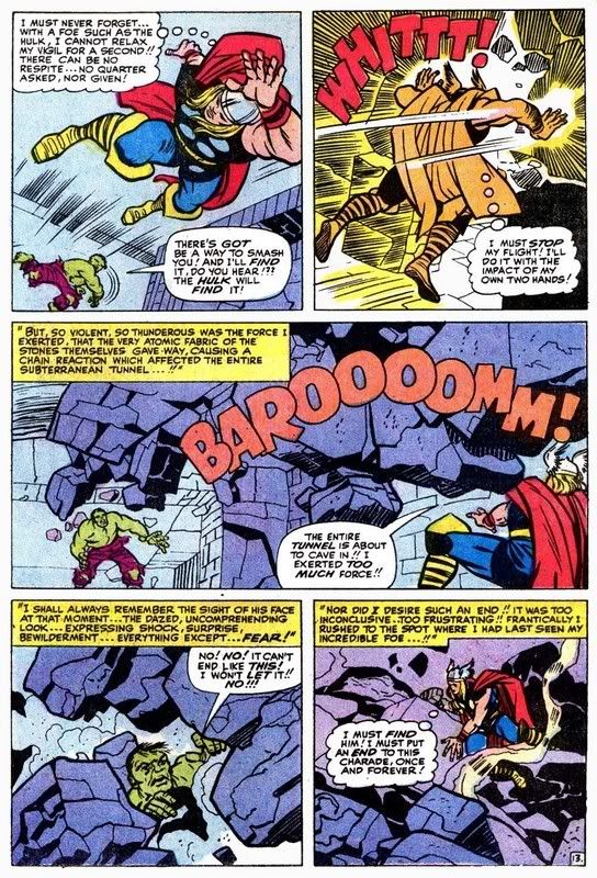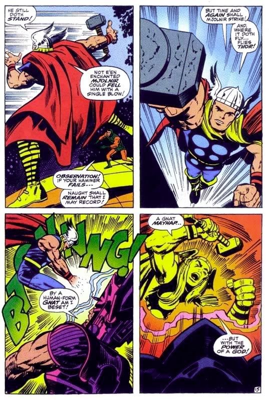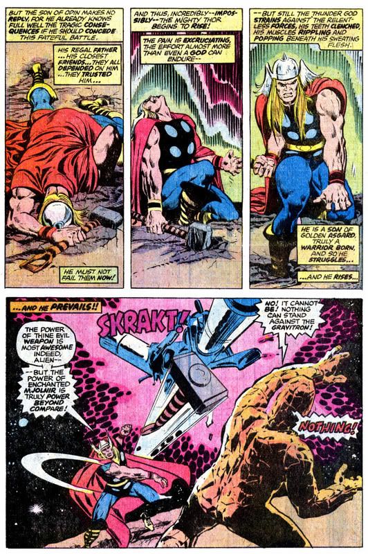Thor mad, beating up Grog like nothing. Shows he doesn't want to beat him up, after he's already out. Grog also has Thor's hammer here.