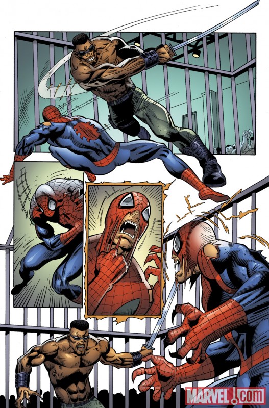 Blade and Spiderman are both under the influence of a drug called fang with basically makes them bloodlusted, but apparently they loose most conventional thought, basically it's a slug fest until one of Blade's punches knocks Spiderman out of the mind-control, and spiderman uses this momentary control to break himself and Blade out: