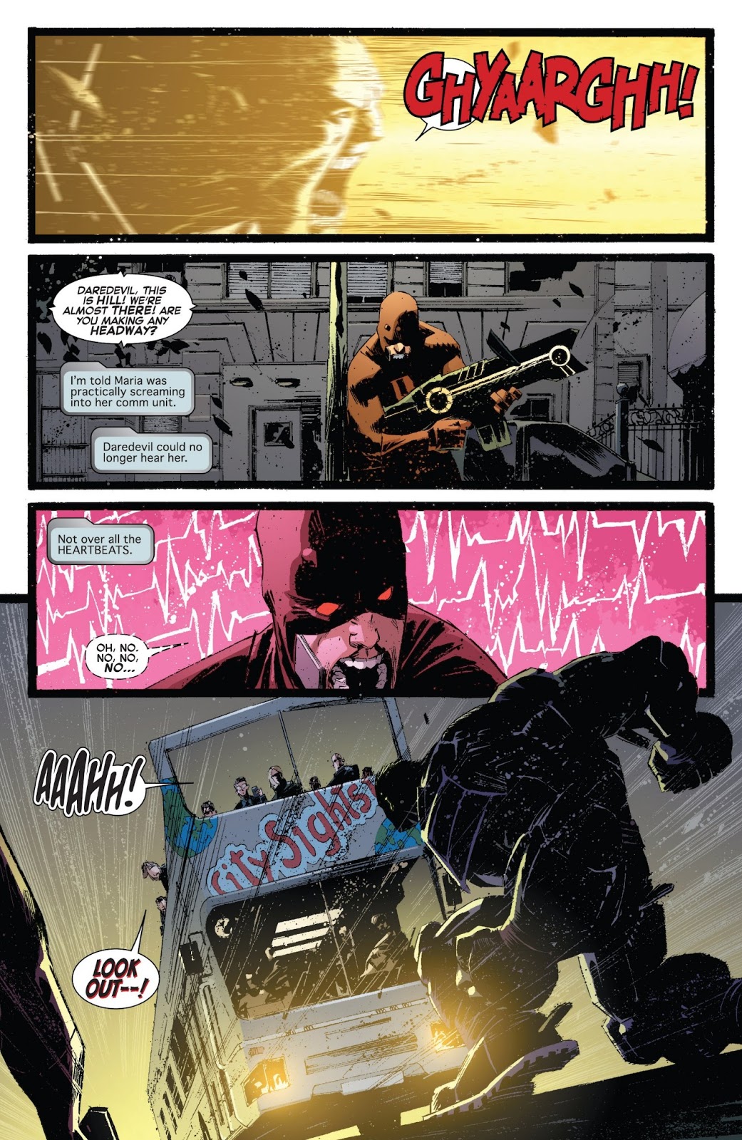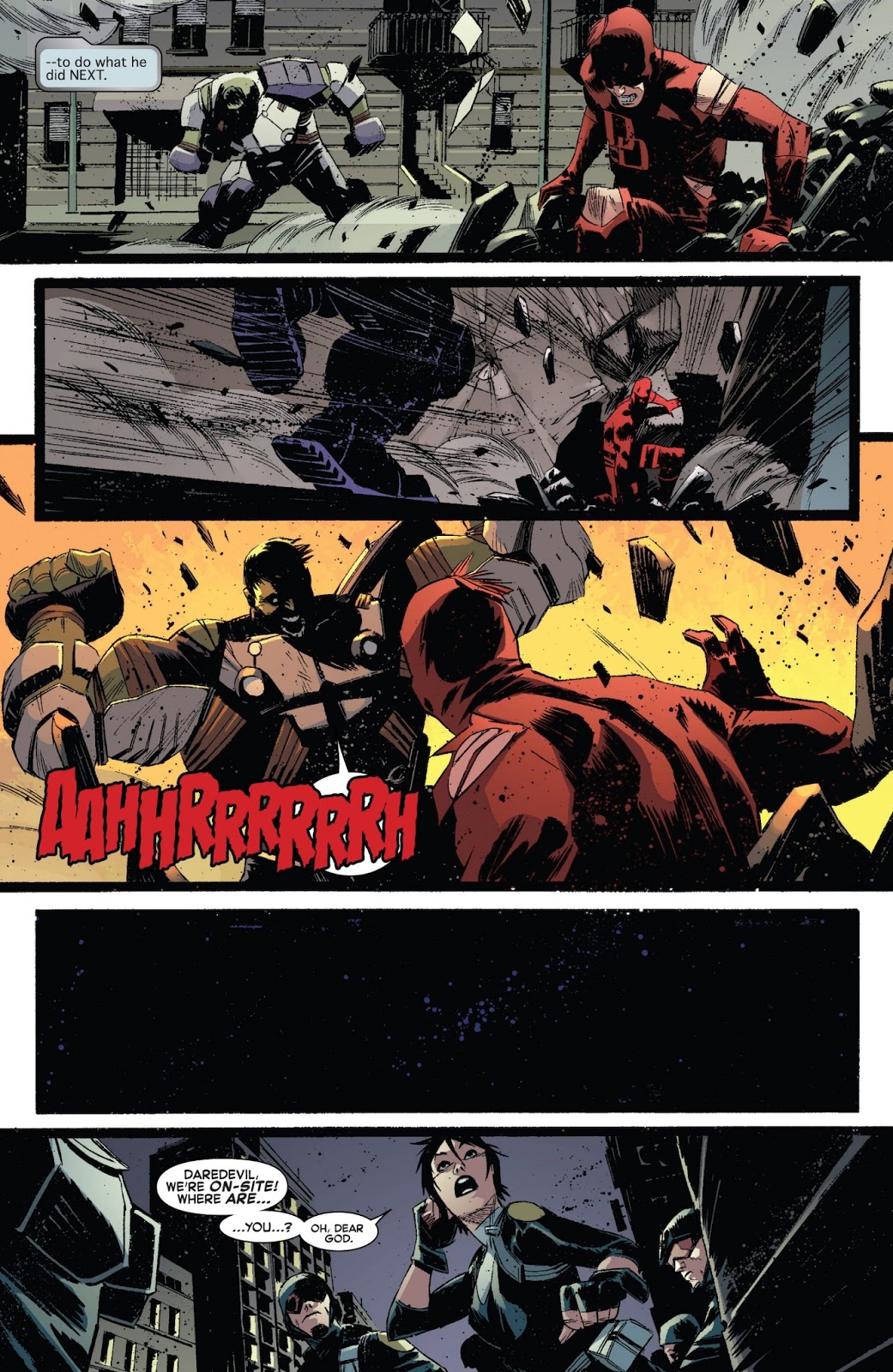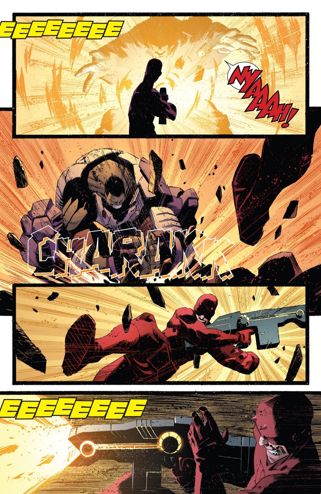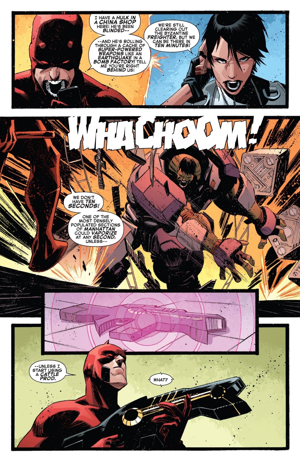 This is actually a pretty dumb fight. First mistake is Thor level weapon? If it was just regular blast I could understand stand, but a sub atomic manipulator really isn't a level weapon its, if you don't have a shield on your done type weapons lol. DD could withstand the weapon if he had a basic shield on really. This isn't to down Hulk or anything but they way they made the fight was kinda stupid, DD didn't even try to jump use his agility just kinda did little leaps to. I just felt like this fight was so off, they tried to hard and kinda failed in this one, the attack in the first comic against AIM where he took that blast that was suppose to do something to adamantium made perfect sense, this just sounded completely stupid all together.