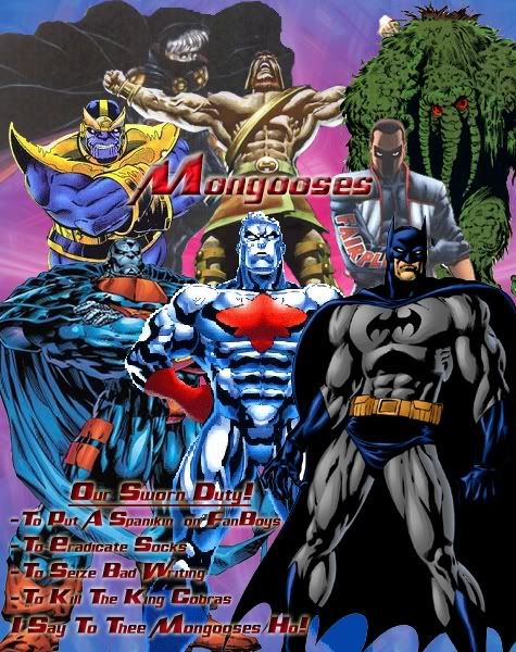 gather round children, and i'll tell you all a tale. The humble tail, of the beginning of the mongooses. A few months ago, when I was jsut afloating user, Trick and I conversed on a joke about Frank Welker, and during those days, Xmeat ran flamboyantly unmatched. Then came Hercules. A new user, willing to lick poles. Trick and I welcomed him, and it wasn't long to Sym joined us on our hulk hunting quest. I started the trend of making silly banners, and it caught on, until the fateful day, we saw Herc withstanding a whipser from Blackbolt. The brainchild of Grey Fox, Me, and Tricky arrose, and we created the hulkbusters. Unfortinetly Digi locked it, but by this time our folds grew. We had Badabing and Jason now, and it was from my soft meaningless sarcastic pitch to anme ourselves the mongooses, that Herc ran with the idea. Ah yes Herc and I had so much fun with the idea, and soon I'd create this very thread, with the hilarity of the opening post, the very post, that'd allow us to keep this thread open. Our thread was simple, but funny. It wasn't til Herc pitched a sarcastic idea to recruit users, til our braindead freind Trickster invite Kaya and Marea over. and soon Smurf and Martian would join. Guy would follow with his brother as well. Smurf and others would make dumb comments upsetting Bada, Herc, Marea, and Kaya, getting pwned by them, and Trick would upset Marea time and time again, but luckilly, our team bond was strong, and we were able to maintain, and luckilly for faceman, he missed most of the conflict. ladies and gentlemen, I bring you the origin of the mongooses, a simple, but charming rant, from Redatom65