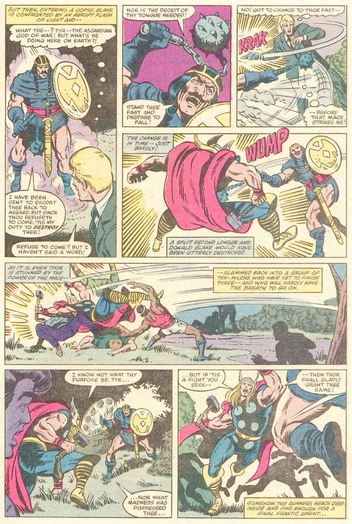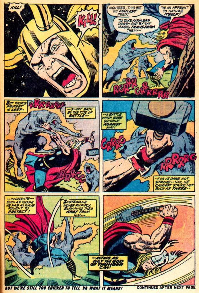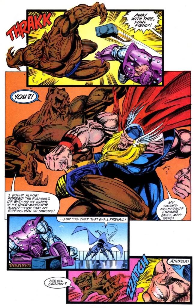 Some of them have Thor being hit with the blunt end of an object, have swords breaking apart in the frenzy of battle but not necissarily on Thor's skin (which is a typical portrayal of old Thor comics in battle), have Thor being cut, don't have Thor being hit by ANYTHING....